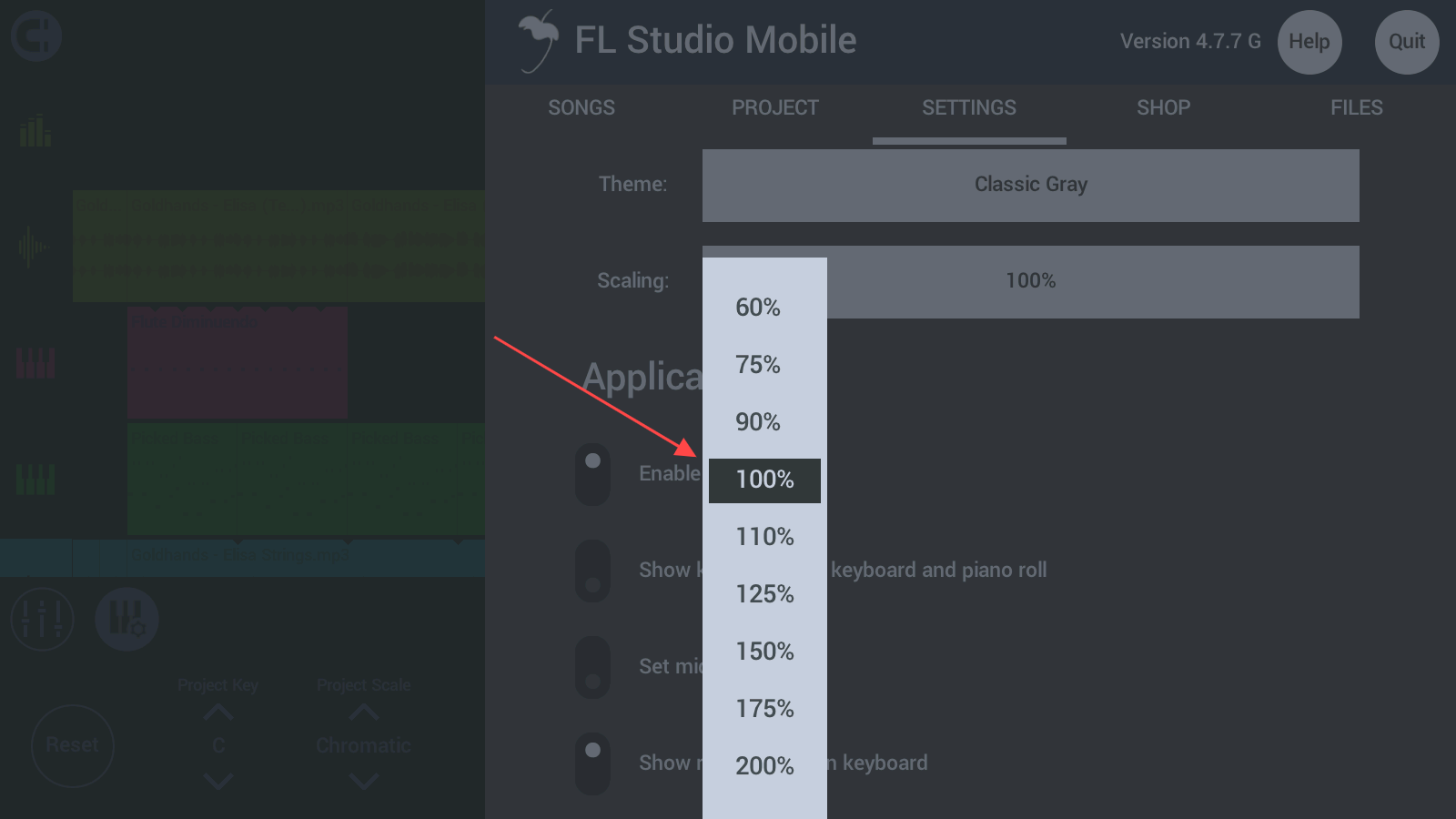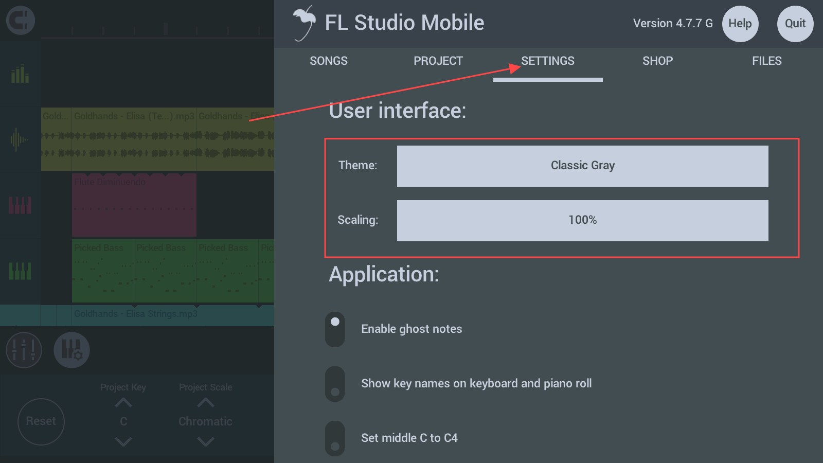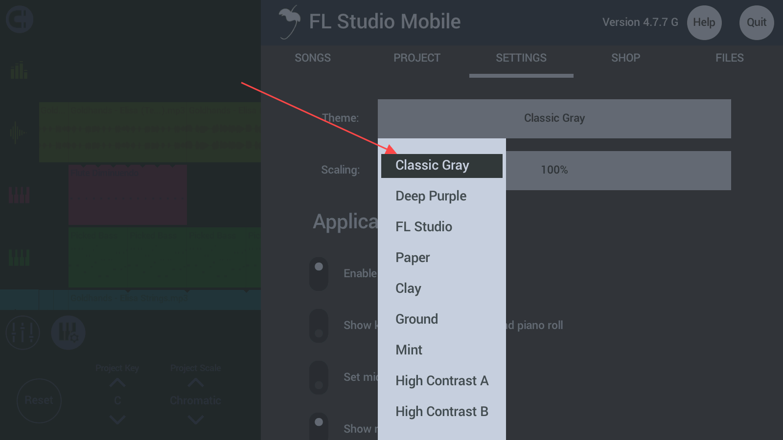 2、點(diǎn)擊Theme選項(xiàng)右側(cè)顯示當(dāng)前主題的區(qū)域,會(huì)彈出一個(gè)包含多種主題選項(xiàng)的下拉菜單,其中有Classic Gray、Deep Purple、FL Studio等不同風(fēng)格的主題可供選擇。