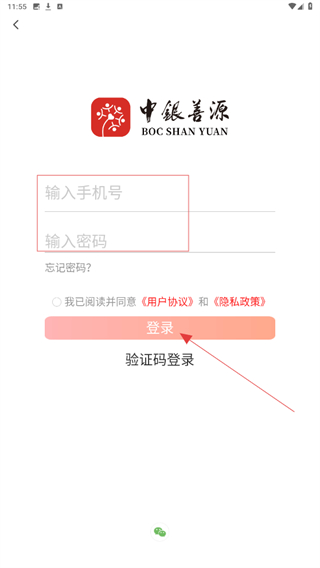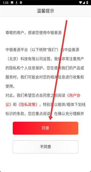 1、點擊“溫馨提示”彈窗的“同意”,進入中銀善源主界面。