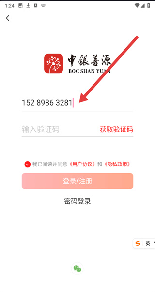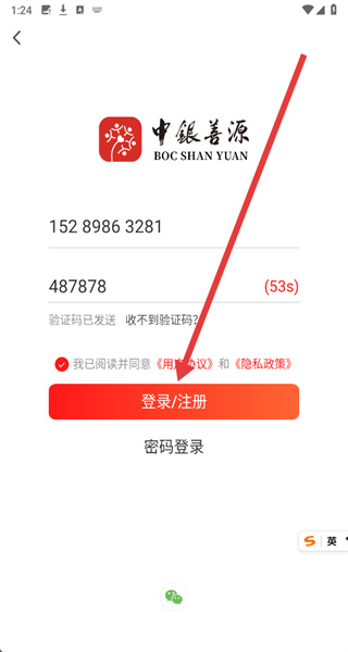 4、輸入收到的短信驗證碼,勾選協(xié)議后點擊“登錄/注冊”按鈕,完成賬號注冊登錄。