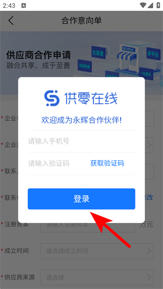 3、在合作意向單頁面,輸入手機(jī)號(hào)和驗(yàn)證碼,點(diǎn)擊登錄。
