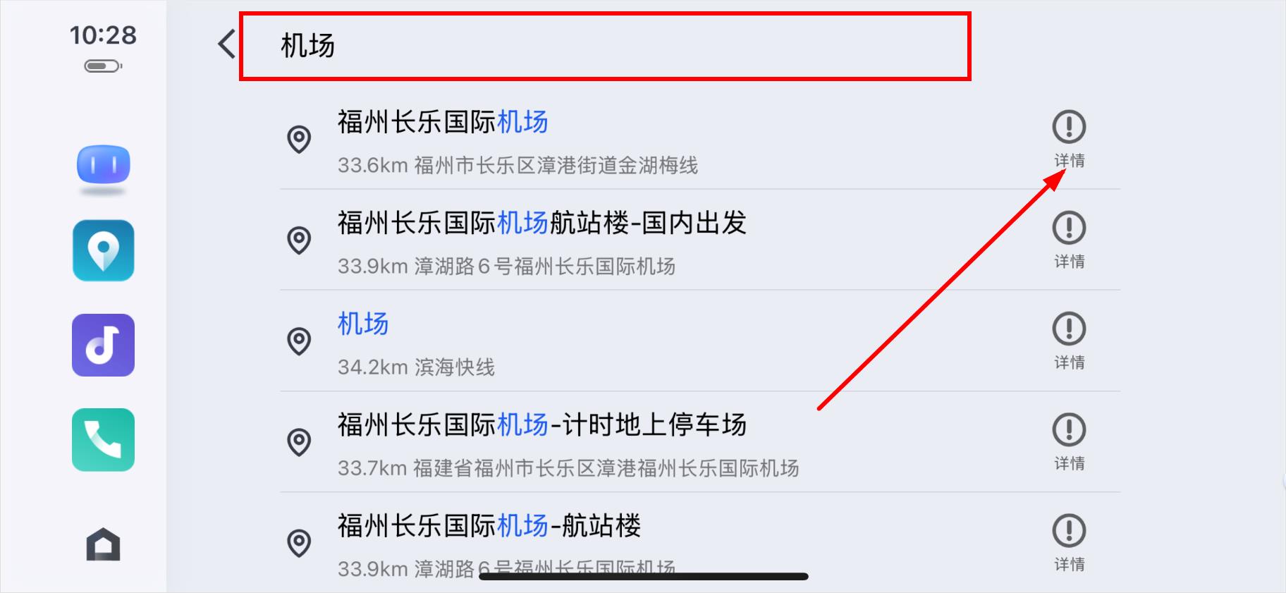 3、在輸入框中輸入你要前往的地點(diǎn),比如機(jī)場,然后在搜索結(jié)果中點(diǎn)擊目標(biāo)地點(diǎn)的詳情。