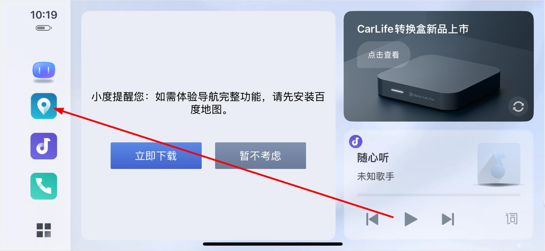 1、打開百度carlife應(yīng)用,進(jìn)入主界面后點(diǎn)擊左側(cè)列表中的地圖圖標(biāo)。