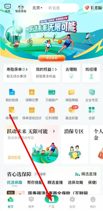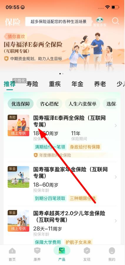 1、打開(kāi)中國(guó)國(guó)壽APP,點(diǎn)擊底部產(chǎn)品,進(jìn)入保險(xiǎn)產(chǎn)品展示界面,開(kāi)啟選購(gòu)第一步。