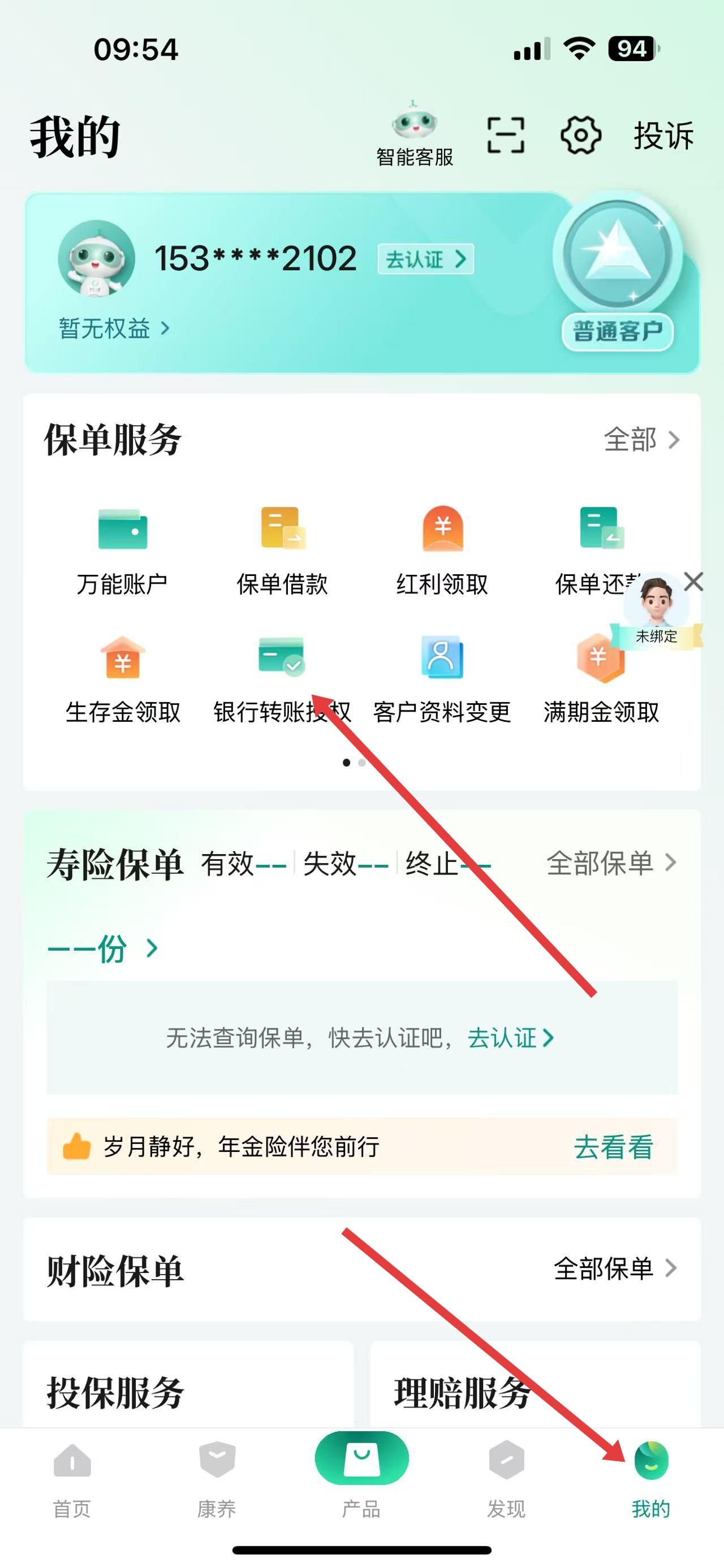 1、打開中國人壽壽險應用,點擊底部導航欄中我的,進入個人中心頁面,在該頁面中,點擊其中的銀行轉賬授權選項。
