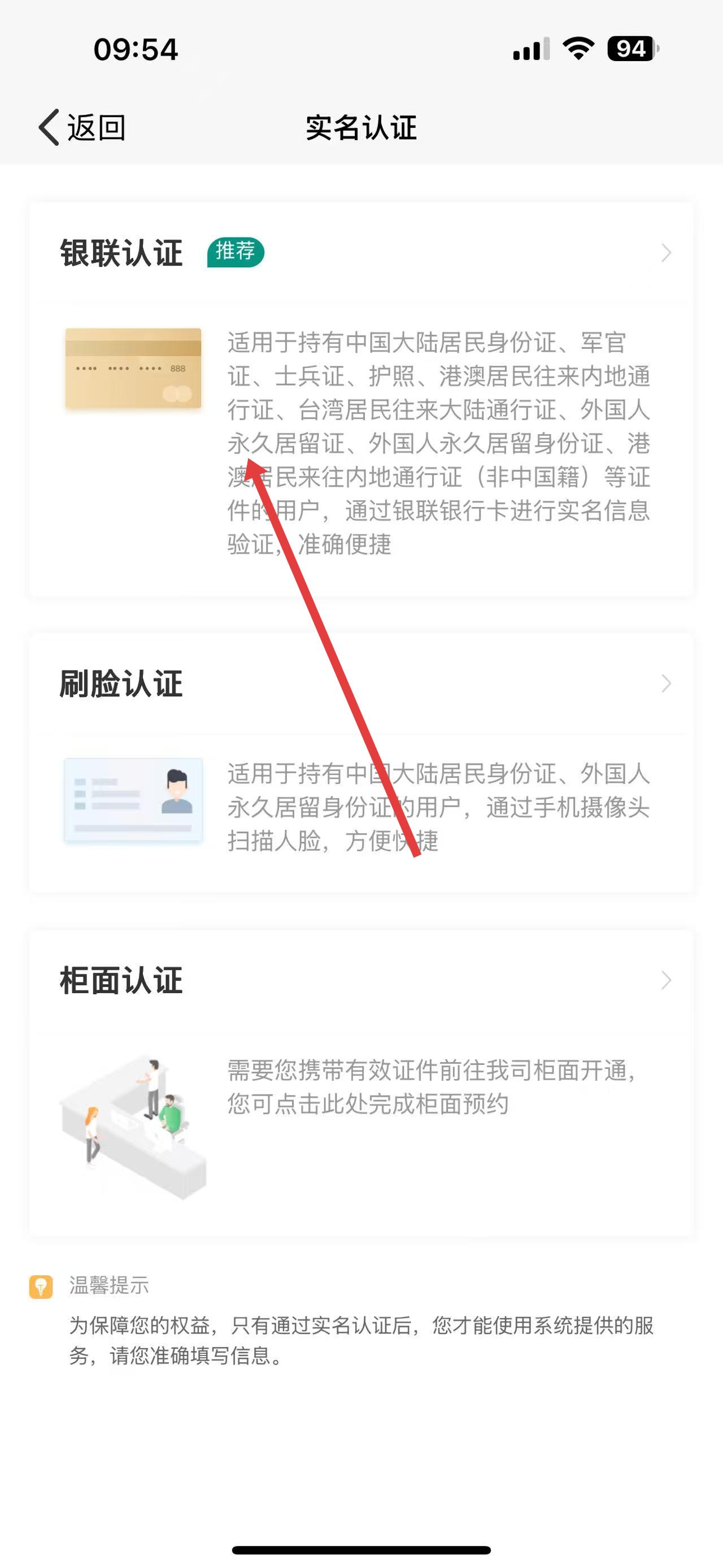3、進入實名認證頁面,您可以看到銀聯(lián)認證、刷臉認證、柜面認證三種認證方式,若要綁定銀行卡,推薦選擇銀聯(lián)認證,完成銀行卡綁定及實名認證操作。