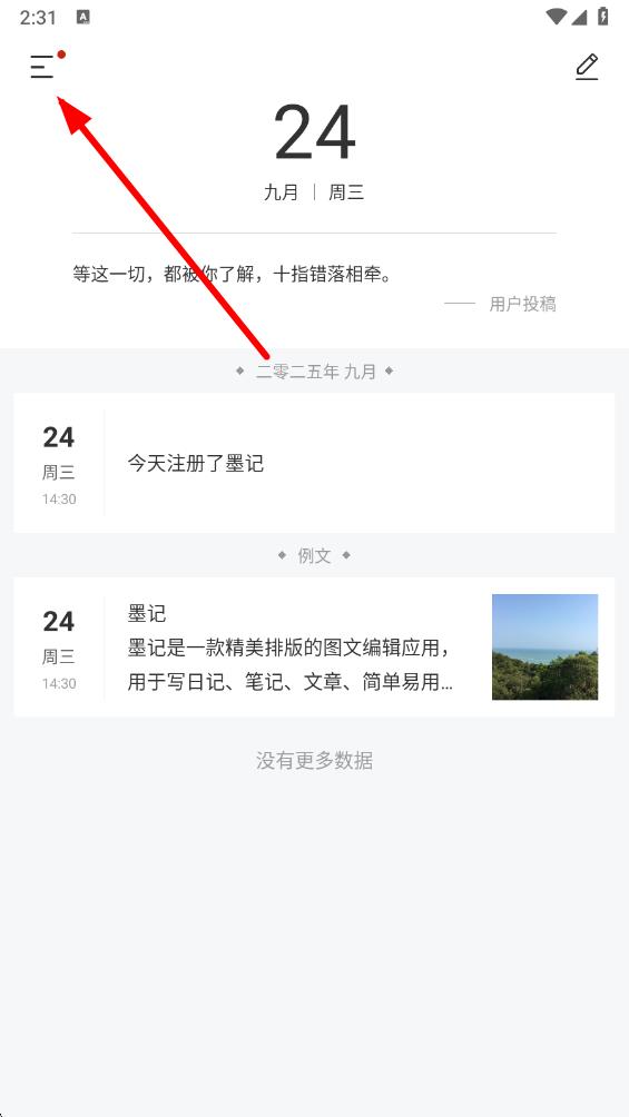 1、打開墨記日記app,點(diǎn)擊左上角的菜單圖標(biāo),打開側(cè)邊欄。