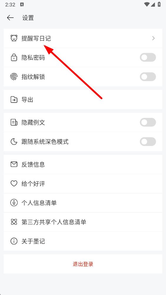3、在設(shè)置頁面里,點(diǎn)擊提醒寫日記選項(xiàng),進(jìn)入提醒設(shè)置界面。