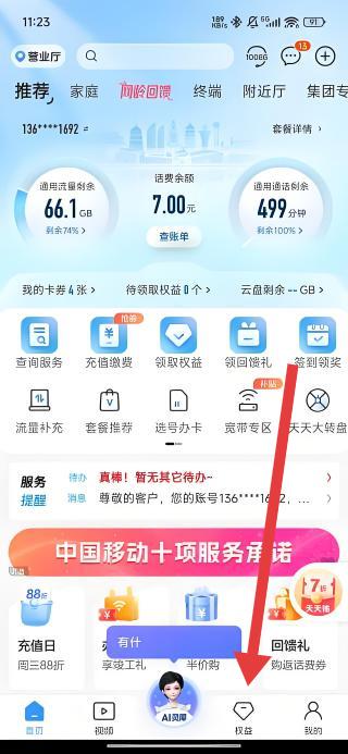 1、打開中國移動APP首頁,點擊底部導(dǎo)航欄權(quán)益選項,進入中國移動權(quán)益超市頁面,可瀏覽各類會員權(quán)益。