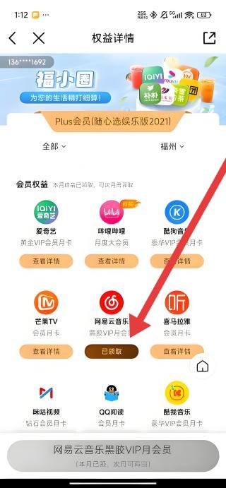 3、進入權(quán)益詳情頁,可查看Plus會員(隨心選娛樂版2021)包含的權(quán)益,如網(wǎng)易云音樂黑膠VIP月卡等,按需領(lǐng)取使用。