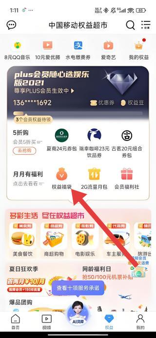 2、在權(quán)益超市頁面,找到并點擊權(quán)益福袋模塊,進入權(quán)益詳情展示界面,查看會員專屬權(quán)益。
