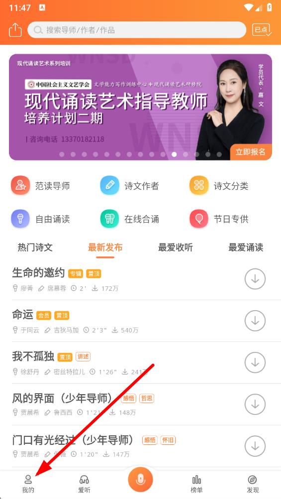 1、打開為你誦讀app,點擊底部導航欄中的我的選項,進入個人頁面。