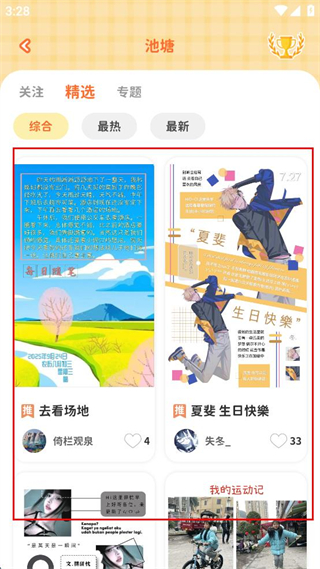 4、在池塘界面即可瀏覽關(guān)注、精選、專題等板塊的手帳內(nèi)容。