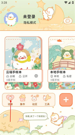 3、登錄后返回首頁(yè),點(diǎn)擊下方的池塘圖標(biāo),進(jìn)入池塘界面。