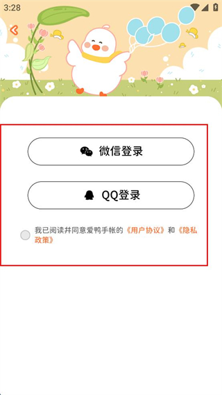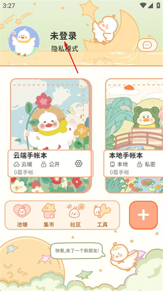 1、點(diǎn)擊愛鴨手帳首頁(yè)的未登錄區(qū)域,進(jìn)入登錄選擇界面。