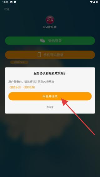 4、當(dāng)服務(wù)協(xié)議和隱私政策指引彈窗時(shí),點(diǎn)擊同意并繼續(xù)的按鈕即可完成后續(xù)的步驟。