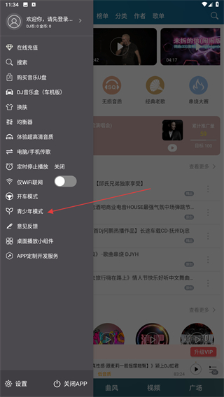 2、在左側(cè)彈出的菜單欄中,點(diǎn)擊青少年模式的按鈕。