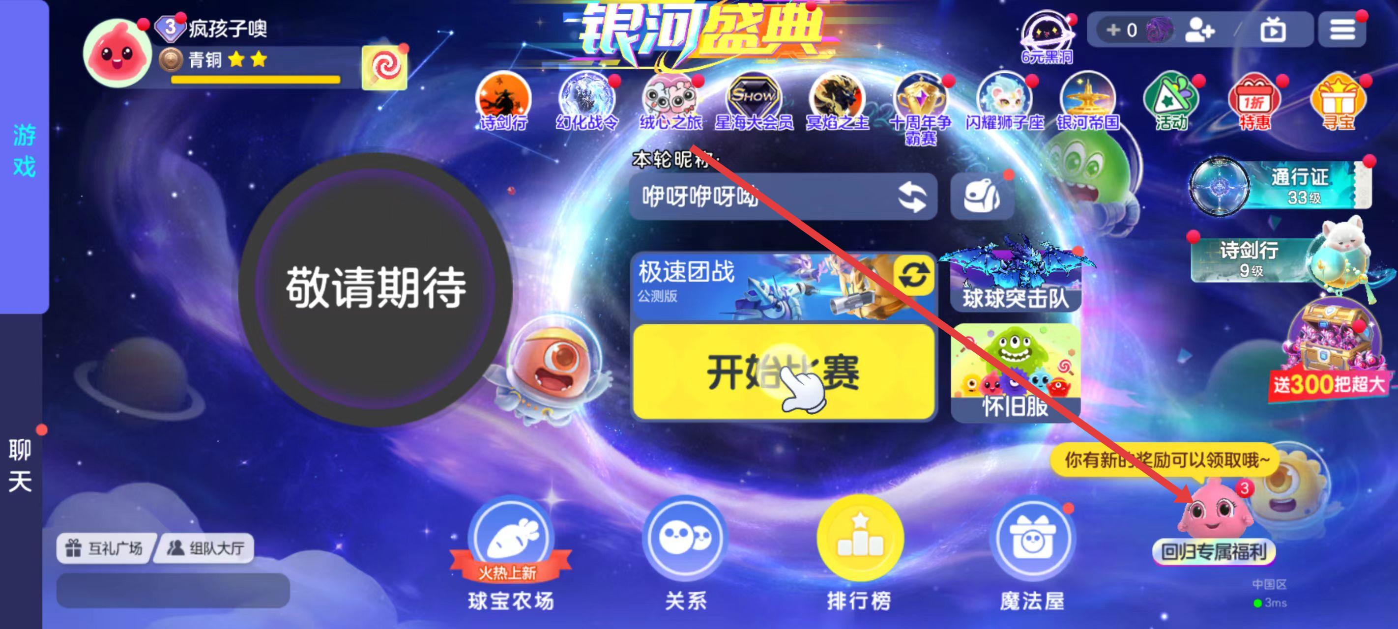 1、進入球球大作戰(zhàn)游戲主界面,找到并點擊右下角帶有紅點提示的回歸專屬福利按鈕,進入回歸福利活動頁面。