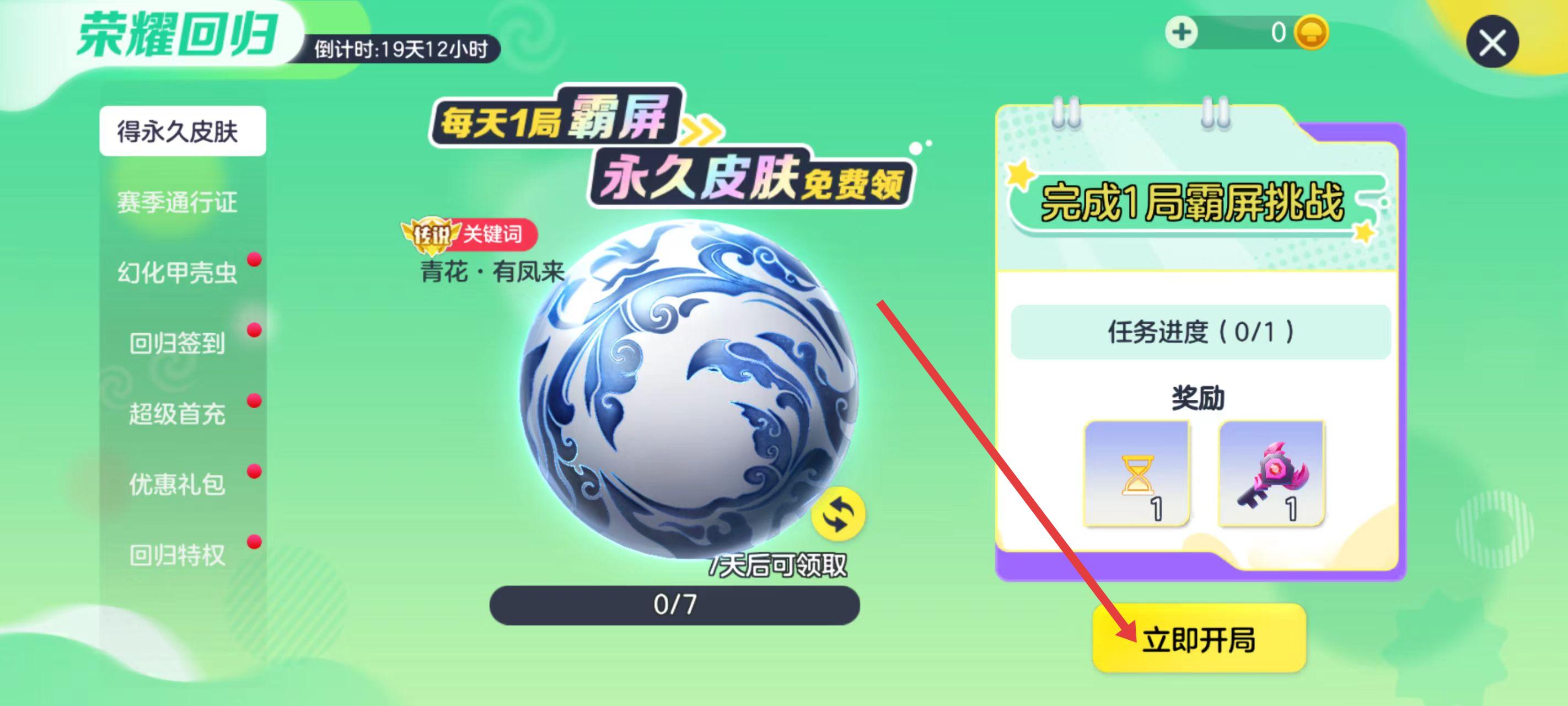 3、選中皮膚后,查看獲取該皮膚的任務要求,比如完成1局霸屏挑戰(zhàn)。點擊立即開局參與相關游戲模式,完成任務后即可領取對應回歸皮膚禮包。