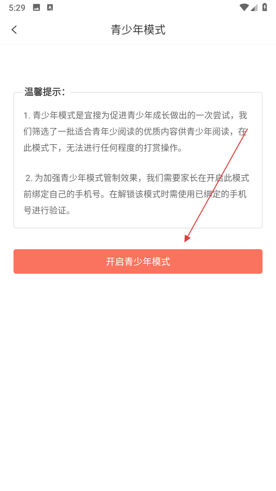 4、在青少年模式頁面,點(diǎn)擊開啟青少年模式按鈕即可。