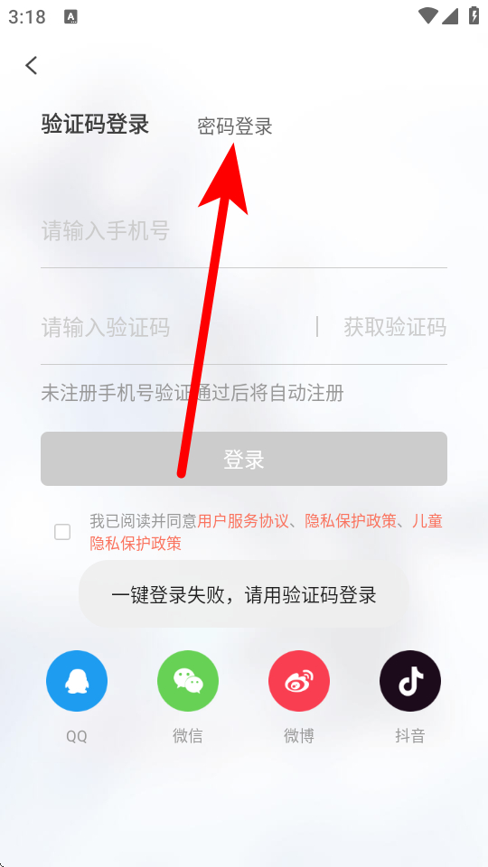 2、在登錄界面,點(diǎn)擊密碼登錄選項(xiàng),切換至對(duì)應(yīng)登錄方式頁面。