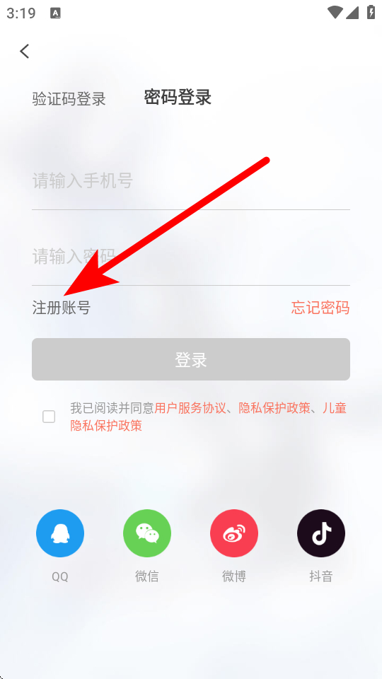 3、在密碼登錄頁面,點(diǎn)擊注冊(cè)賬號(hào)選項(xiàng),進(jìn)入注冊(cè)界面。