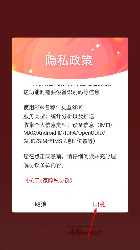 1、打開(kāi)杭工e家,彈出隱私政策提示,點(diǎn)擊同意,進(jìn)入軟件首頁(yè)。