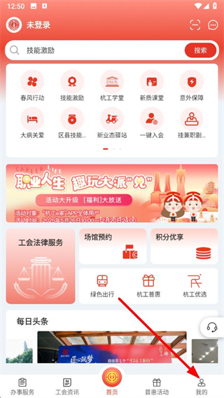 1、打開(kāi)杭工e家app,點(diǎn)擊底部導(dǎo)航欄的我的選項(xiàng)進(jìn)入登錄頁(yè)面。