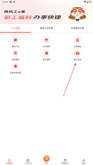 2、進(jìn)入辦事服務(wù)的頁(yè)面內(nèi),點(diǎn)擊醫(yī)療互助的按鈕。