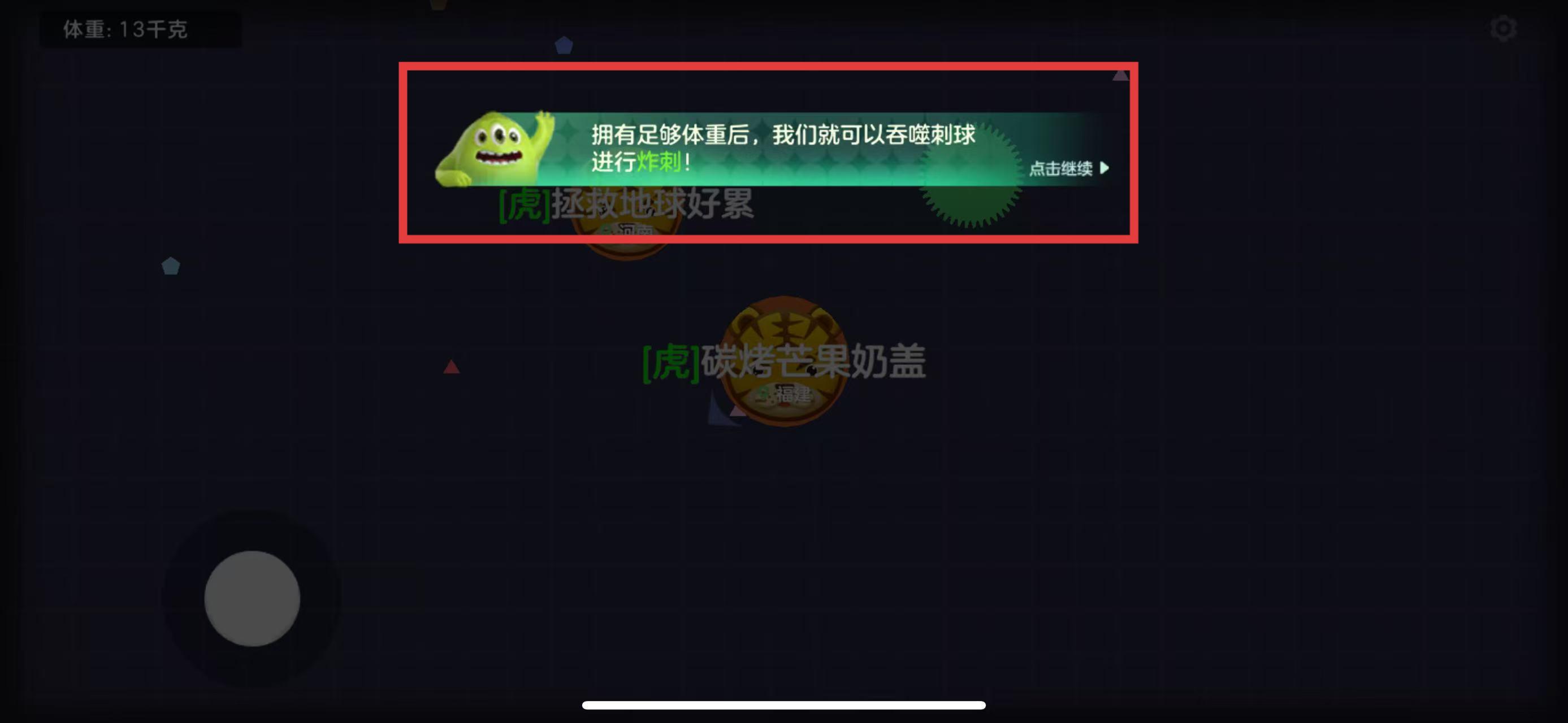 1、當(dāng)體重達(dá)到13千克及以上時,控制球球移動,找到綠色刺球,靠近并吞噬它,完成炸刺操作,可獲得成長助力。