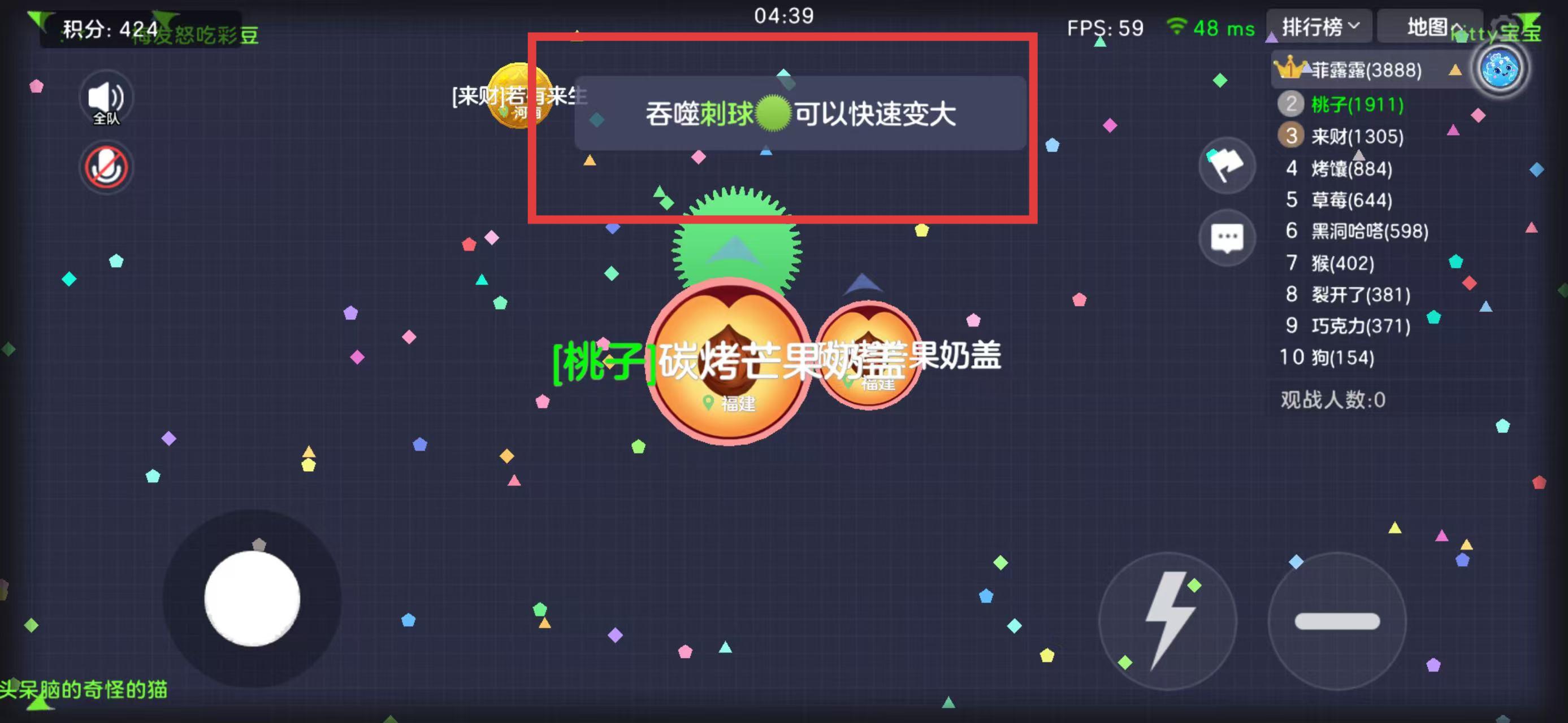 3、當(dāng)球球體積足夠,尋找綠色刺球,吞噬后能快速增加體積,助力在對戰(zhàn)中占據(jù)優(yōu)勢,持續(xù)壯大自己。