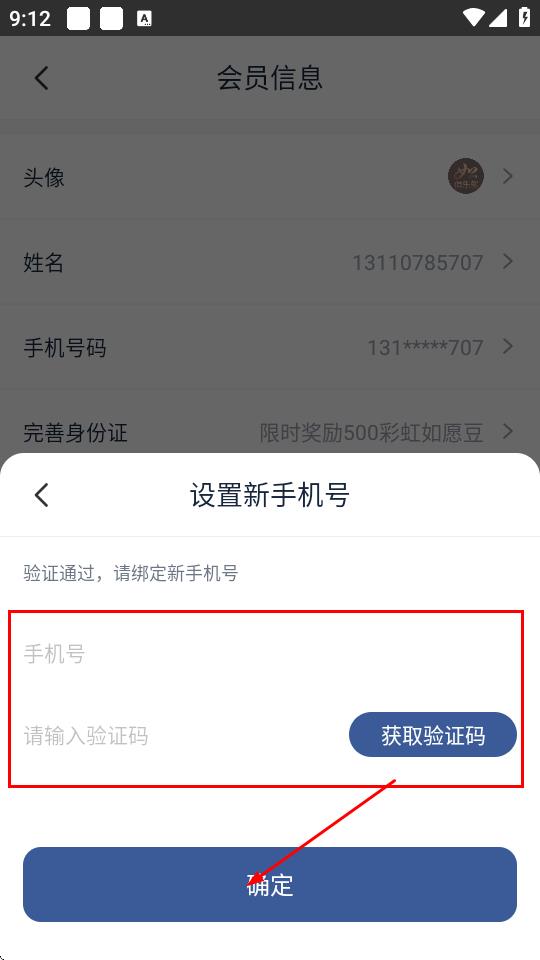 5、輸入新的手機號,輸入新手機號收到的驗證碼后,點擊確定,即可完成手機號的更改。