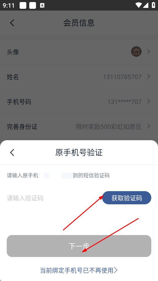 4、在原手機號驗證頁面,點擊獲取驗證碼,輸入收到的驗證碼后,點擊下一步。
