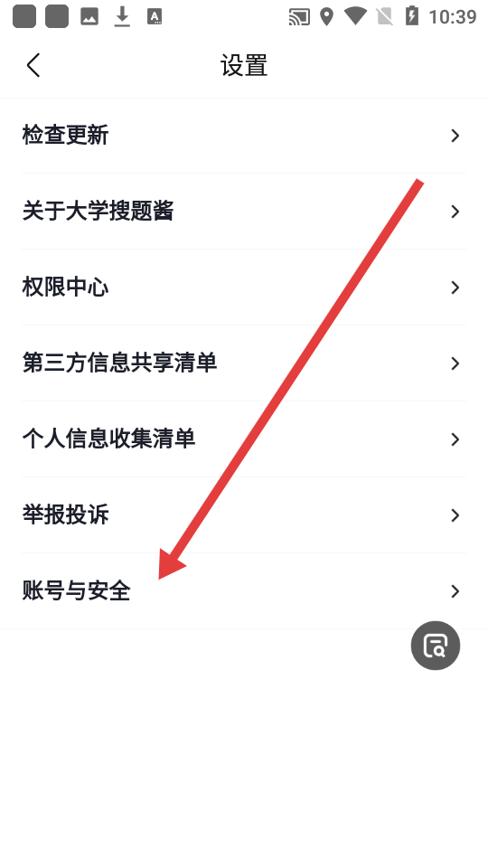 1、打開大學(xué)搜題醬APP進(jìn)入設(shè)置頁,點擊最下方的賬號與安全選項。
