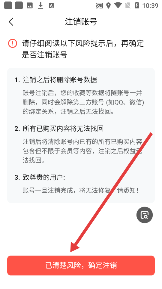 3、仔細(xì)閱讀風(fēng)險提示后,點擊已清楚風(fēng)險,確定注銷。