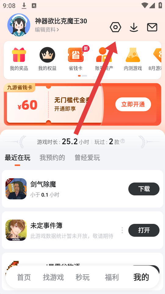 1、進(jìn)入九游我的頁(yè)面后,點(diǎn)擊右上角齒輪形狀的設(shè)置圖標(biāo),進(jìn)入設(shè)置的界面。