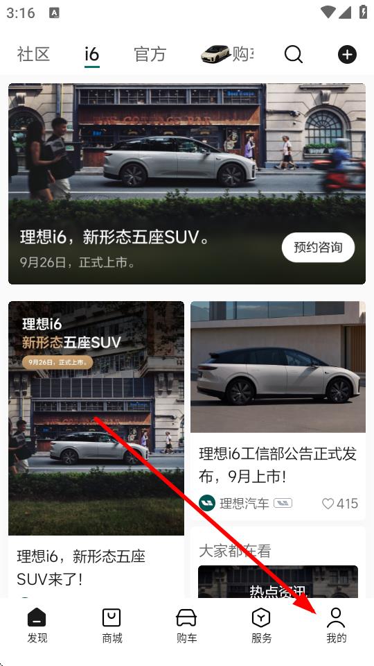 1、打開(kāi)理想汽車(chē)app,進(jìn)入首頁(yè)后點(diǎn)擊底部我的選項(xiàng)。