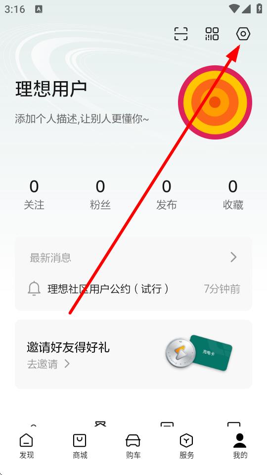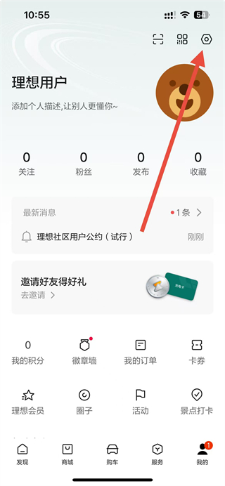 1、打開(kāi)理想汽車(chē)app,在我的頁(yè)面點(diǎn)擊右上角設(shè)置圖標(biāo),進(jìn)入設(shè)置頁(yè)面。
