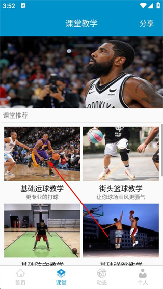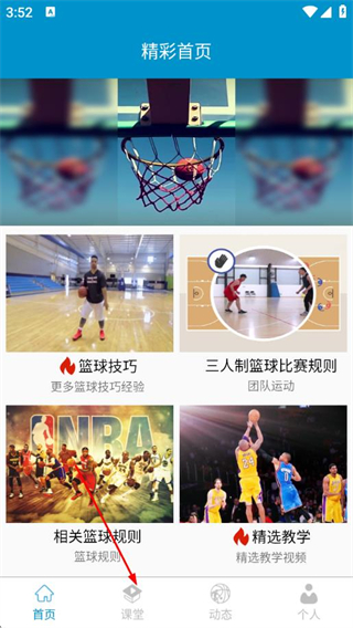 1、打開籃球教學(xué)助手APP,點(diǎn)擊底部課堂。