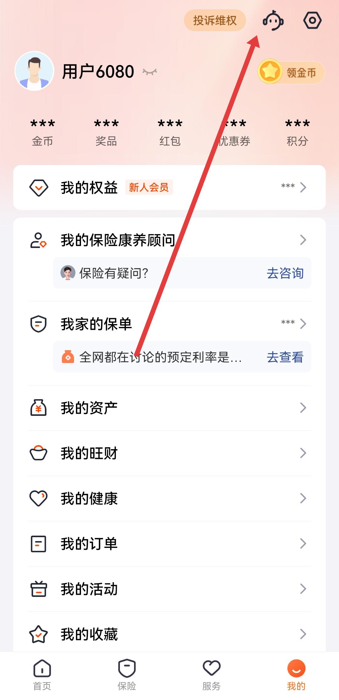 1、打開(kāi)平安金管家APP,進(jìn)入底部導(dǎo)航欄我的頁(yè)面,點(diǎn)擊右上角耳機(jī)形狀的智能客服圖標(biāo),進(jìn)入客服對(duì)話(huà)界面。