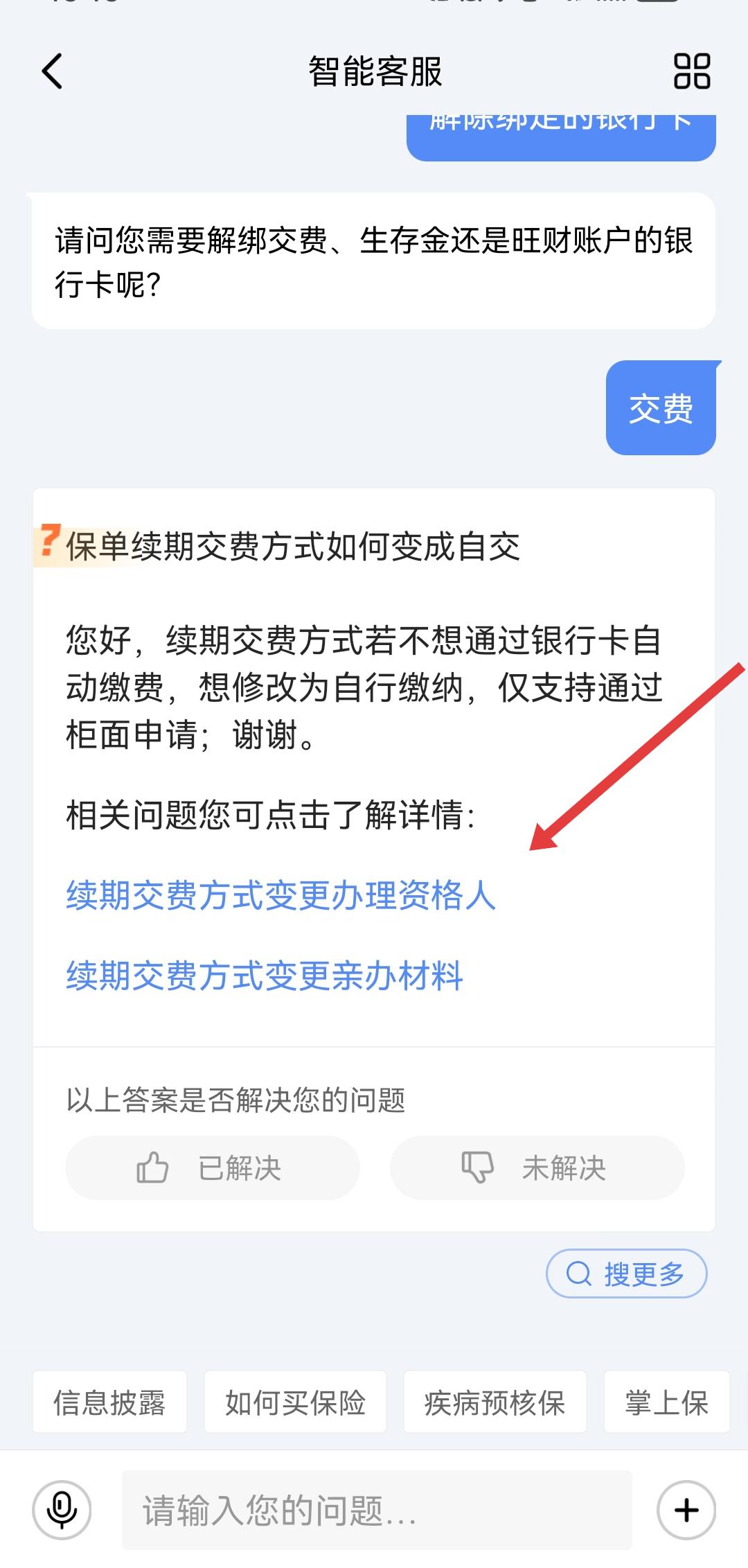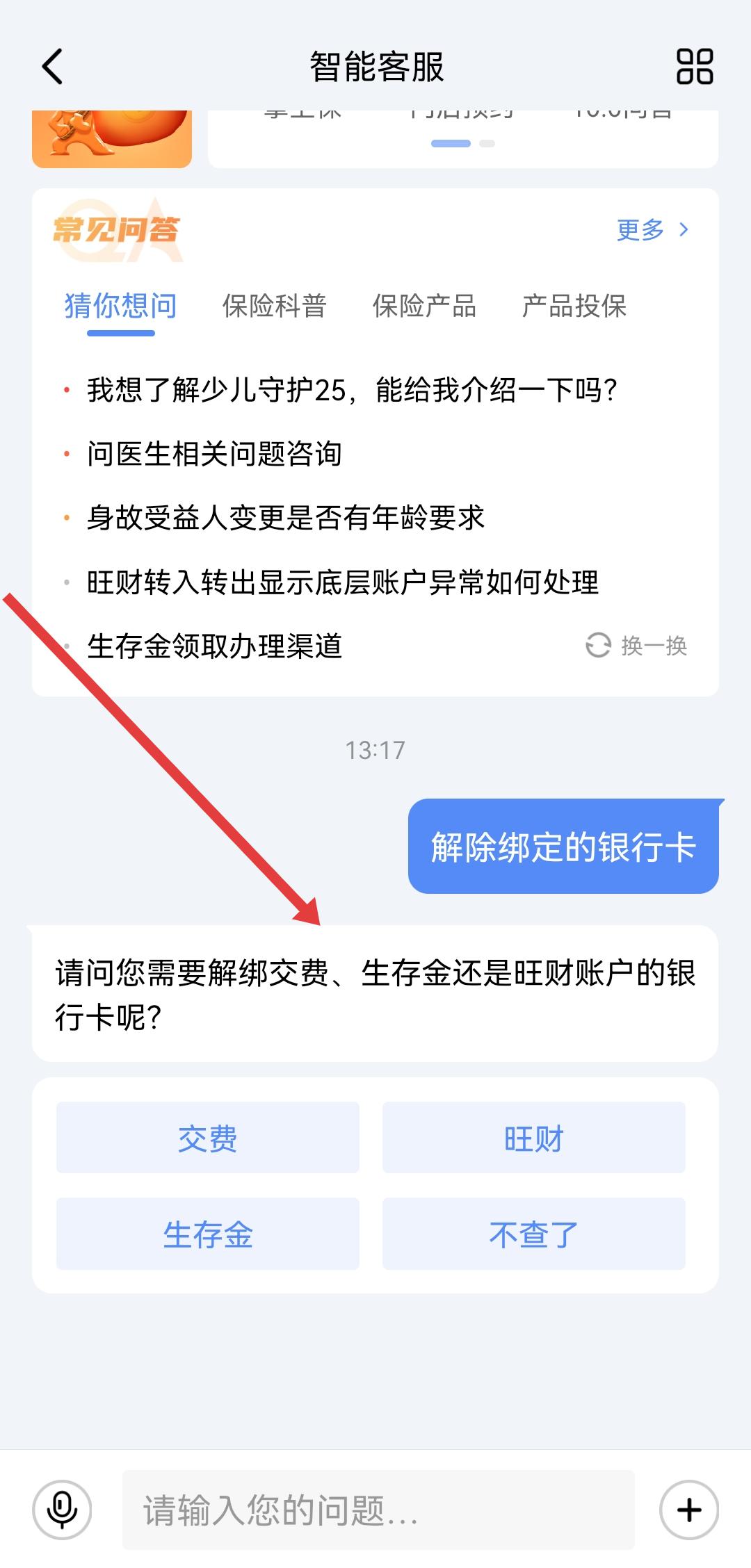 2、在智能客服輸入框中發(fā)送解除綁定的銀行卡,根據(jù)客服回復(fù)選擇需解綁的銀行卡類(lèi)型交費(fèi)/生存金/旺財(cái)賬戶(hù)。