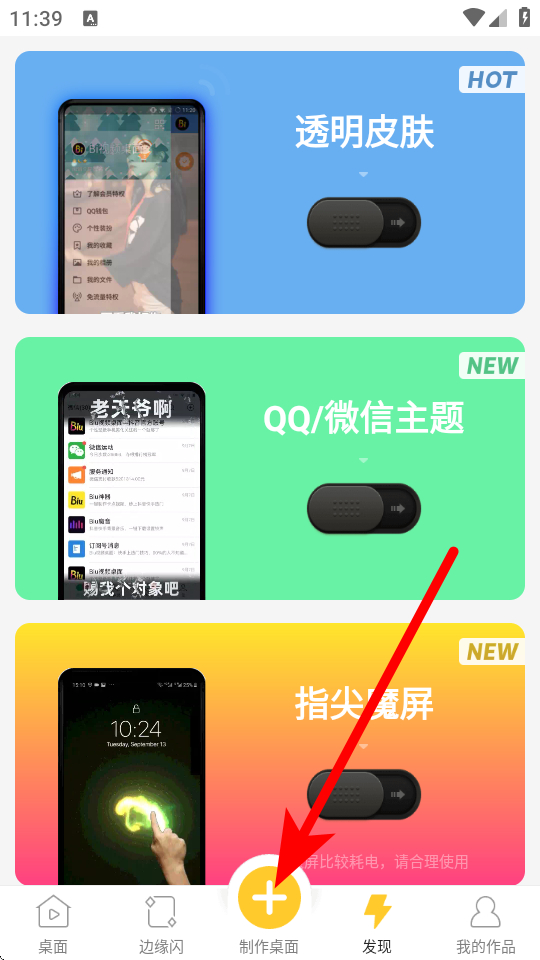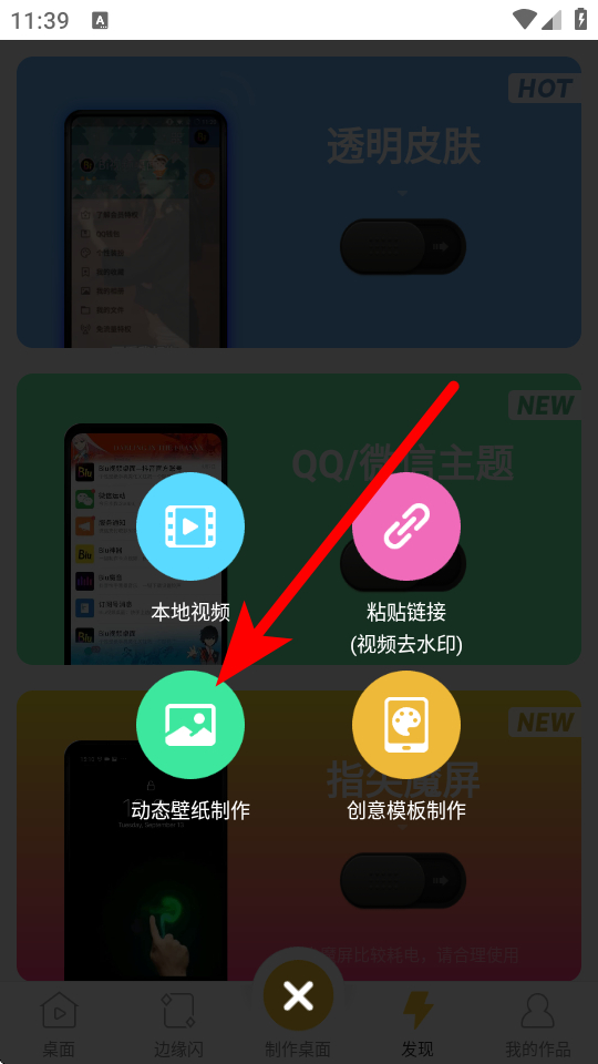 1、在壁紙制作應(yīng)用首頁,點擊制作桌面選項,彈出制作功能菜單。
