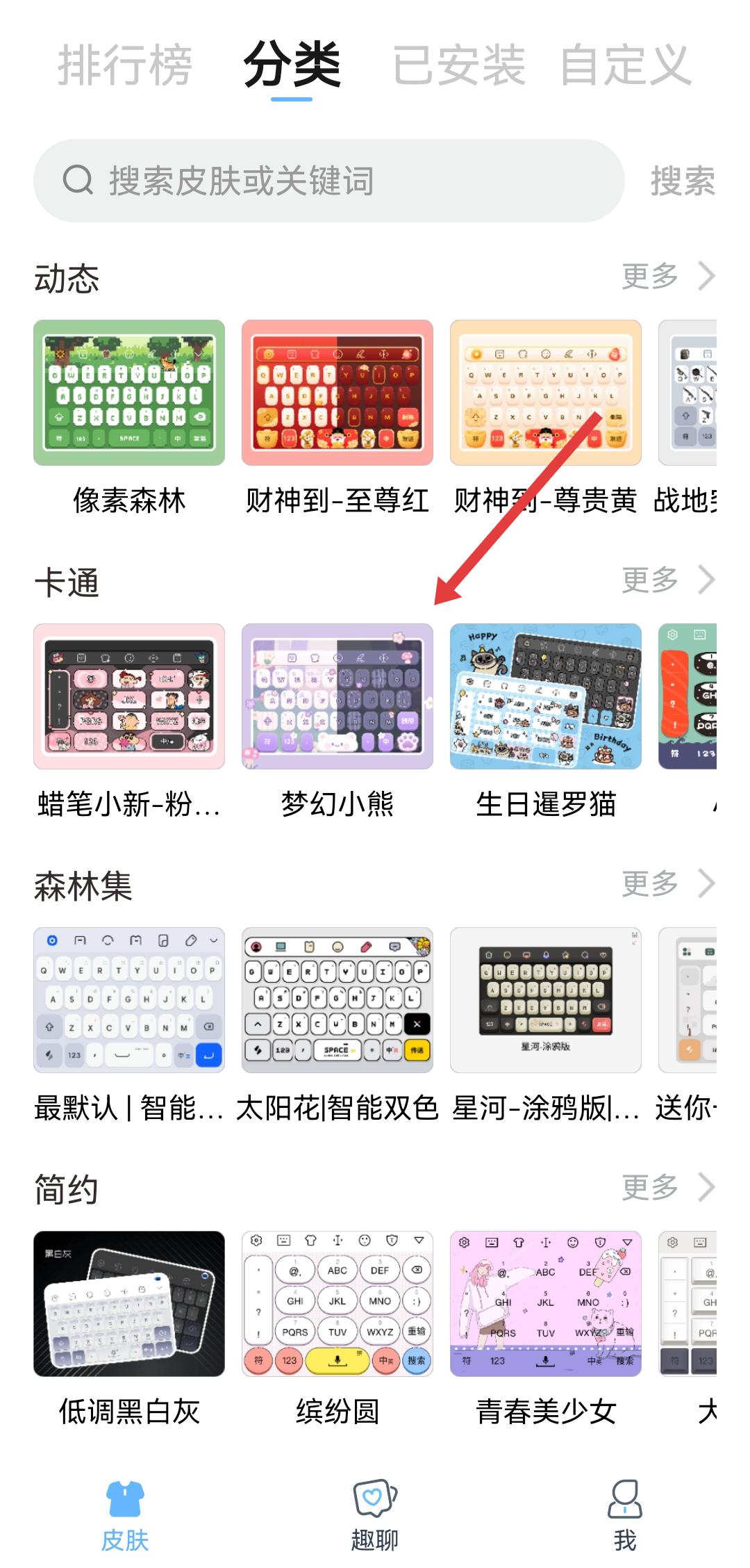 1、打開(kāi)手心輸入法的皮膚中心,在分類(lèi)頁(yè)面的卡通欄目中,點(diǎn)擊要更換的皮膚。