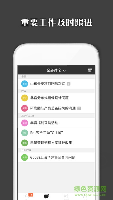 以討論的形式聚合每項工作的所有參與人和相關資源,幫助用戶隨時交流工作難點、跟進工作進度、回顧工作內(nèi)容、分享工作文檔;