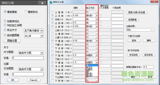 模具總裝圖繪制完成后,可自動(dòng)拆分出模板圖,繪制穿孔、列出加工說(shuō)明、標(biāo)注模板尺寸、以及自動(dòng)套圖框。