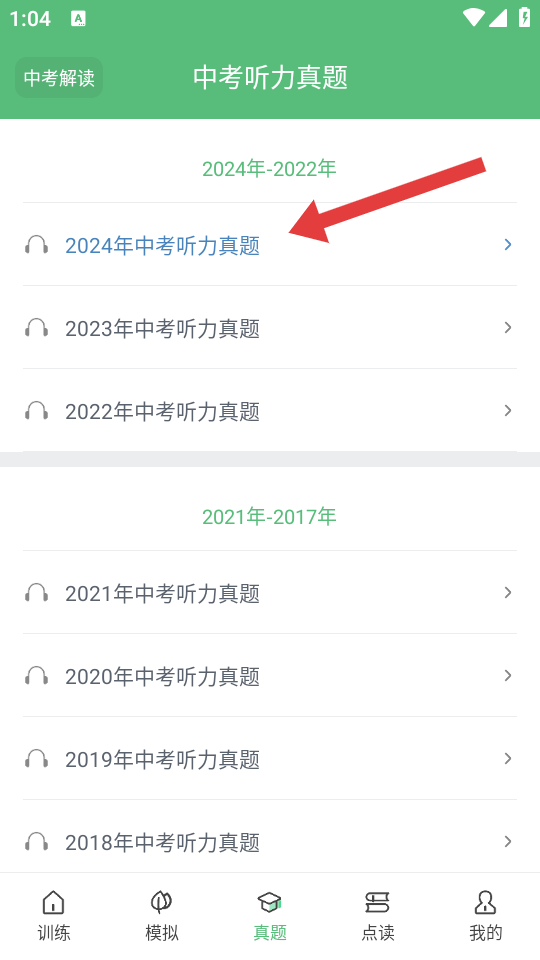 1、進入真題板塊,選擇目標年份真題,進入年份真題列表頁面。