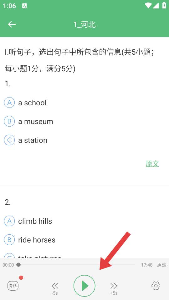 4、點擊播放按鈕,開始聽真題并進行答題,還可利用進度條等調整進度。