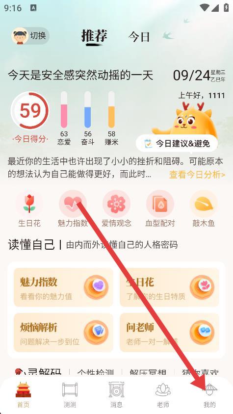 1、打開靈機算命,點擊底部導(dǎo)航欄中我的,進入個人頁面。