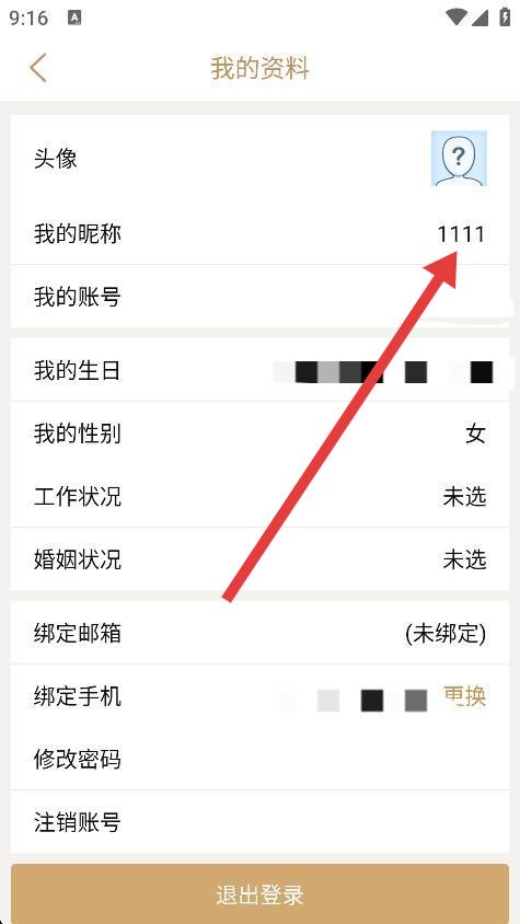 3、在資料頁面里,點擊我的昵稱選項,進入修改昵稱頁面。