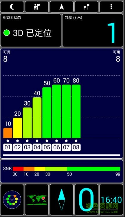 3.GPS信號(SNR),條形圖,顯示出每顆衛(wèi)星的信號強(qiáng)度,以及精度和GPS狀態(tài)。