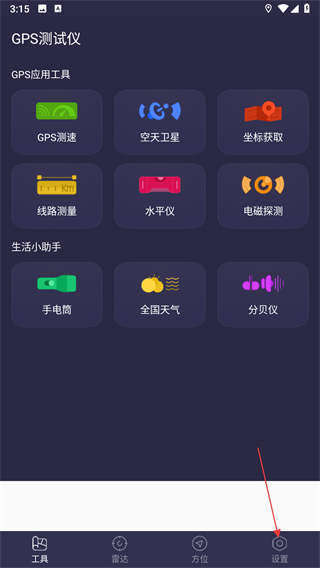1、打開GPS測試儀應(yīng)用,點(diǎn)擊右下角設(shè)置選項(xiàng)。